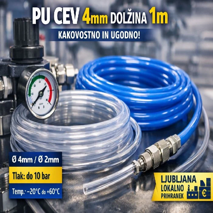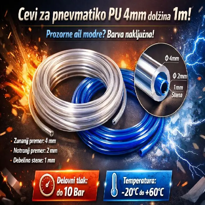 Cevi za pnevmatiko PU 4mm dolžina 1m so zasnovane za zanesljiv pretok. Zunanji premer 4mm, notranji 2mm, debelina stene 1mm. Preprosto. Natančno. Učinkovito. Uporabljam jih tam, kjer šteje vsaka sekunda in vsak bar pritiska!