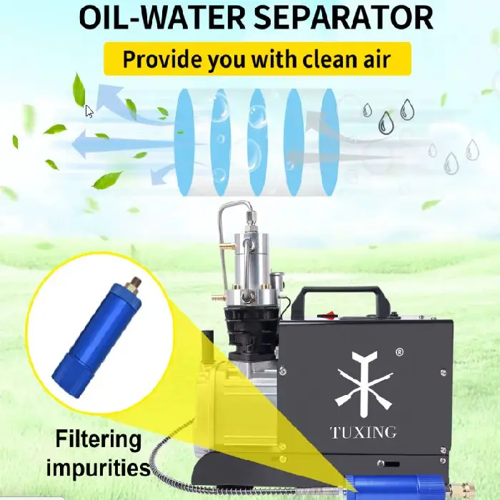 Kompresor vključuje napreden oil-water separator, ki loči vlago iz zraka in zagotavlja 0.001% vsebnost vlage. To pomeni popolnoma čist, suh zrak – brez kondenza, brez korozije in brez skrbi. Vsi filtri so zamenljivi in kompatibilni s PCP puškami, potapljaškimi jeklenkami, paintball sistemi in industrijskimi cilindri.