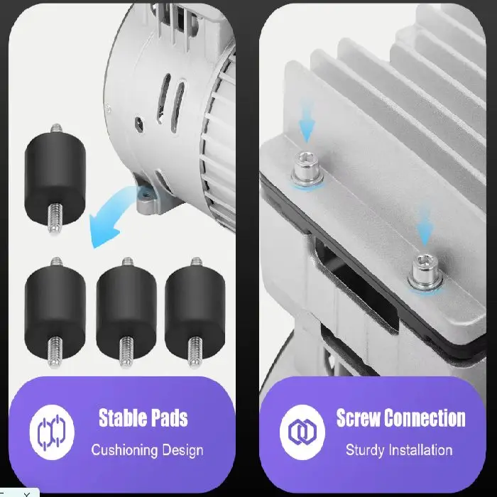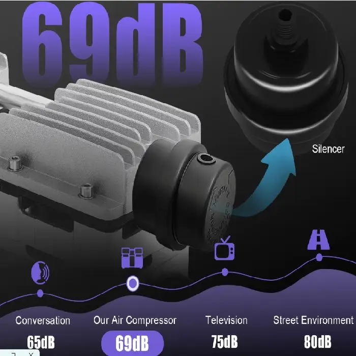 Kompresor uporablja bakreni motor z visoko učinkovitostjo in vgrajenim termičnim zaščitnikom. Zaradi svoje brezoljne tehnologije ne zahteva rednega vzdrževanja, kar pomeni manj stroškov in več prihranka. Ultra tihi ležaji in kakovosten dušilec zvoka omogočata prijetno uporabo tudi v zaprtih prostorih. Idealen je za medicinske, hladilne in tekstilne naprave, kot tudi za polnjenje pnevmatik ali uporabo v plastični industriji.