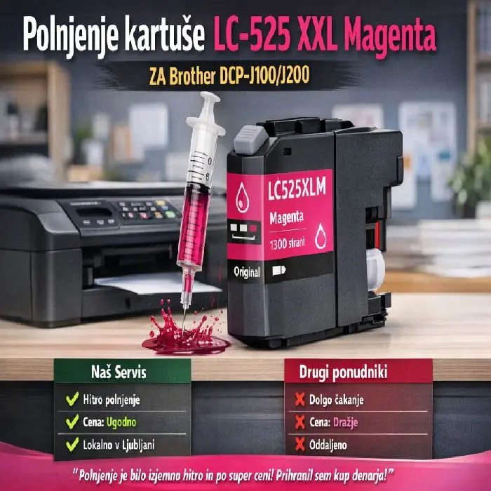 Če ti je magenta ravno zmanjkala, ne kompliciraj. Prinesi Brother LC525XLM (LC525, LC525XL) in poskrbim za polnjenje hitro in ugodno. Svet črnil je lokalno v Ljubljani - in točno zato je to ceneje, bolj enostavno in brez odvečnih korakov!